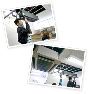 天井設置のまま洗浄します。(設置環境や種類によっては一部異なります。)